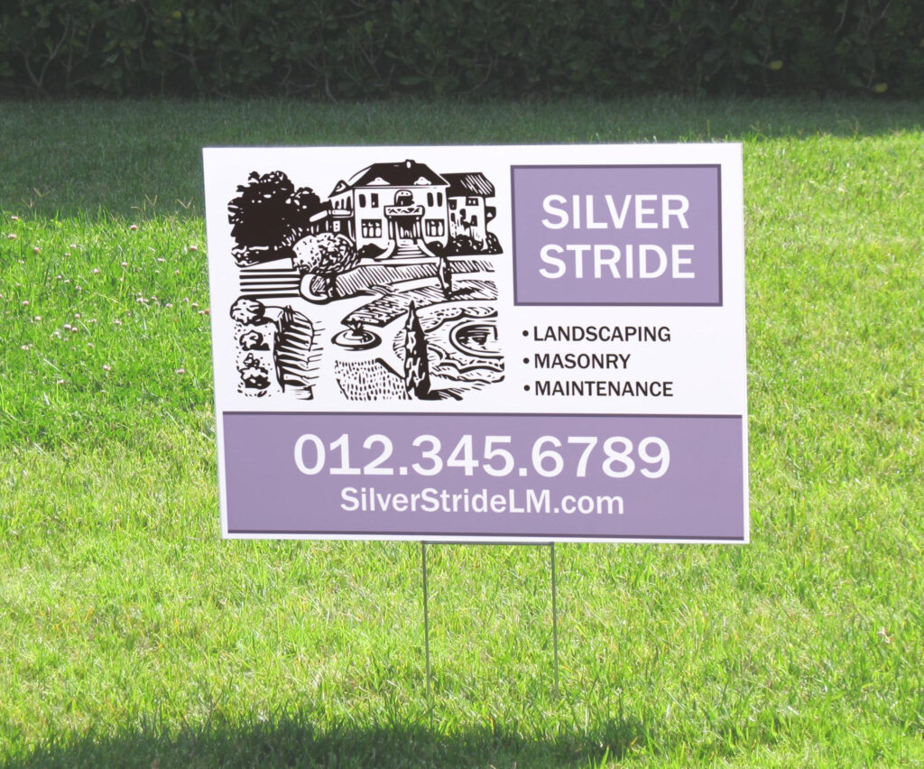 Printed on Adhesive Vinyl and mounted on corrugated plastic, we offer single and double sided signs up 18″x24″ in size. Stakes or grommets available depending on your application.